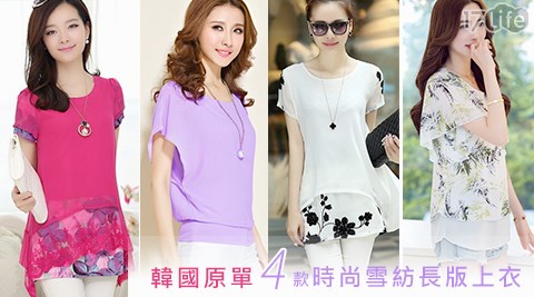 商品訊息簡述: 平均每件最低只要269元起(含運)即可購得韓國原單4款時尚雪紡長版上衣1件/2件/4件,多款多色多尺寸任選。